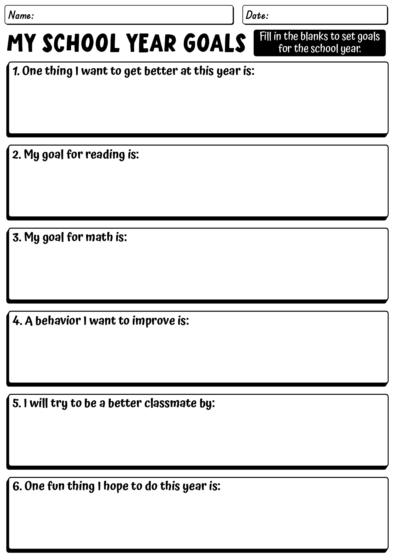 - Encourage kids to set achievable goals for the new school year using worksheets. Have them write down their goals and create a plan for how to achieve them. This can help motivate children and give them a sense of direction as they start the new school year.