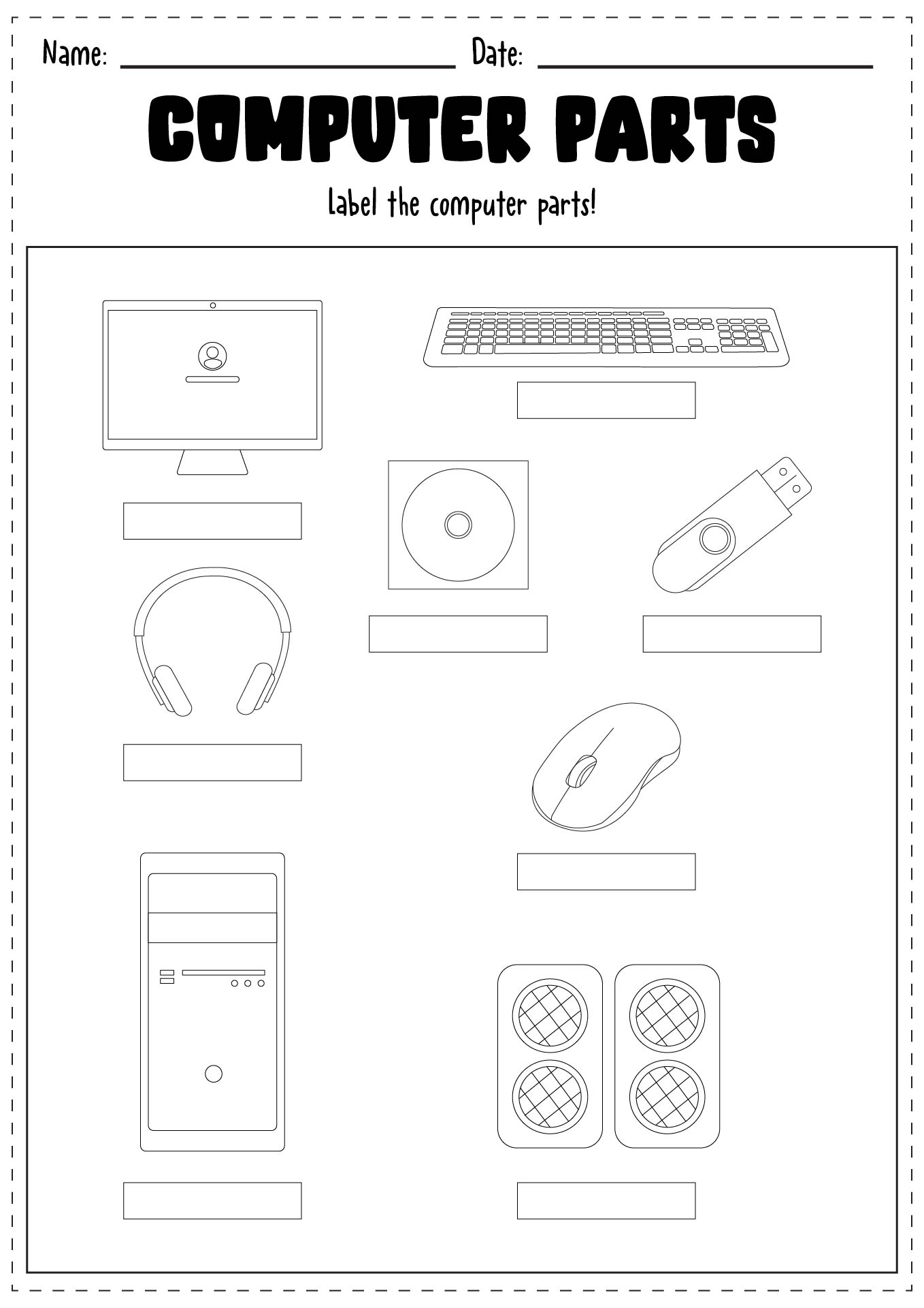 Rather than explaining complex terms like “processor” or “RAM,” these worksheets focus on basic computer parts for kids such as: