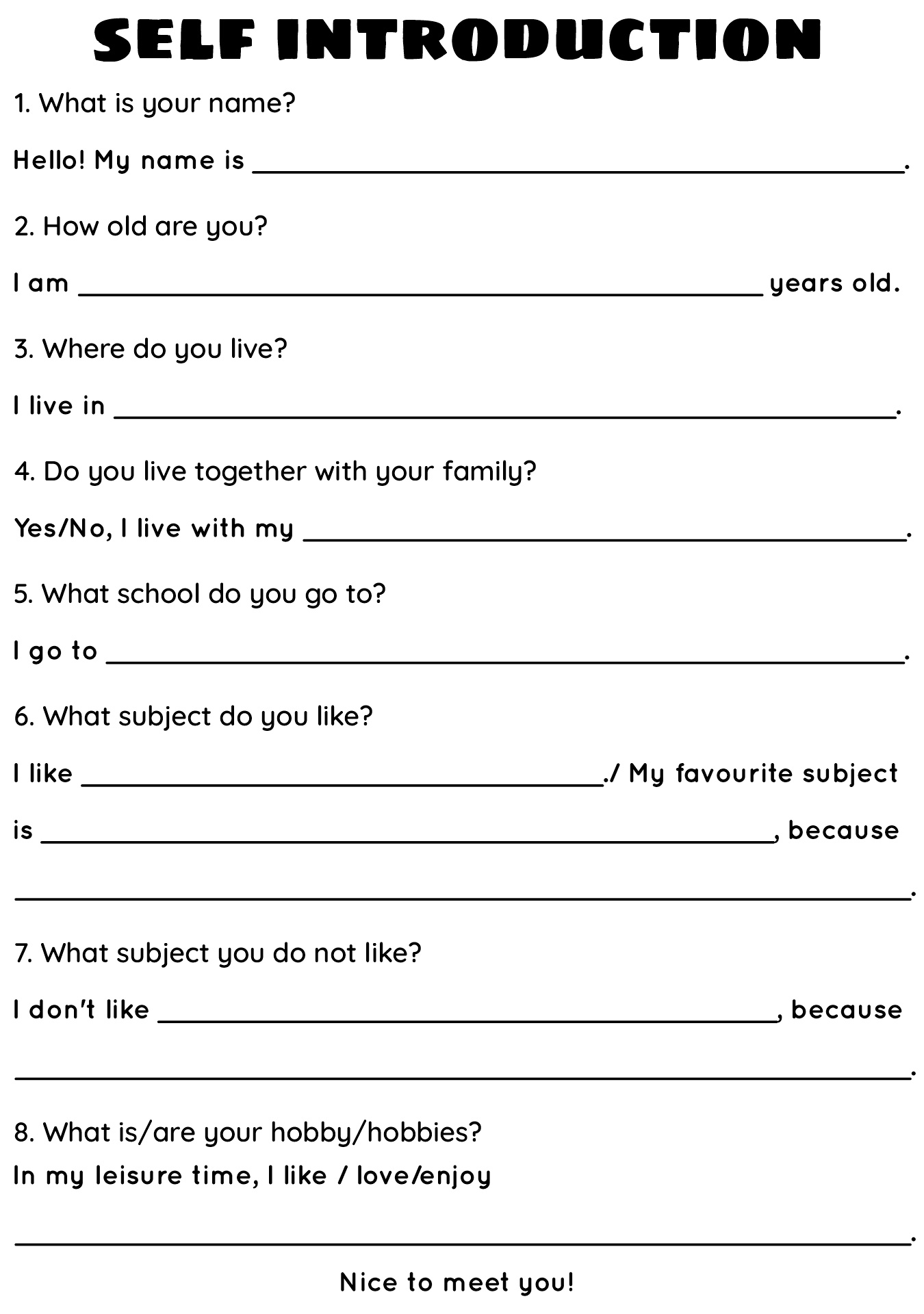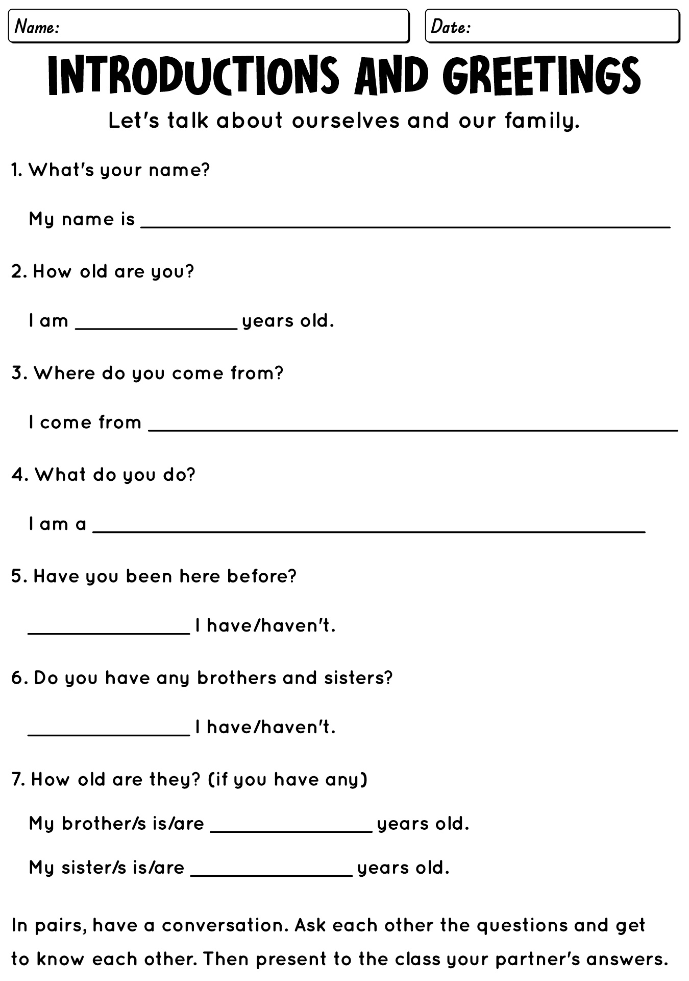 - Elementary School: Introducing more complex introductions and greetings worksheets can help elementary students expand their vocabulary and improve their pronunciation skills. Worksheets that focus on common conversation starters, polite expressions, and cultural differences in greetings can enhance students' language proficiency and cultural awareness.