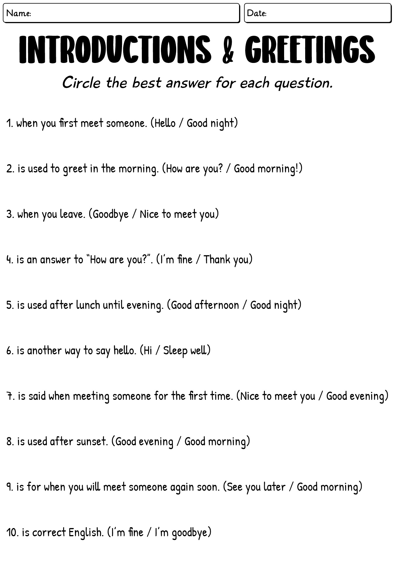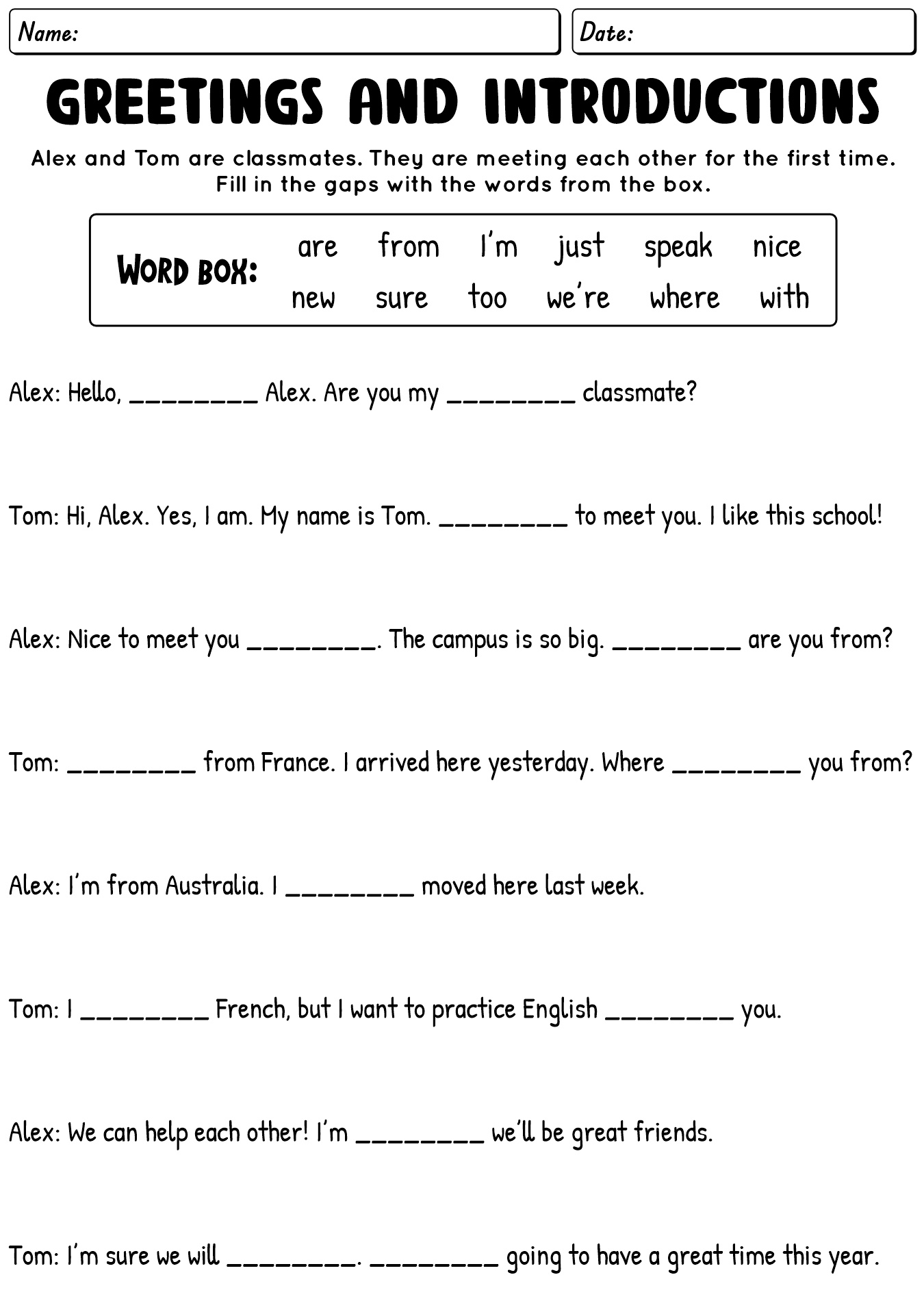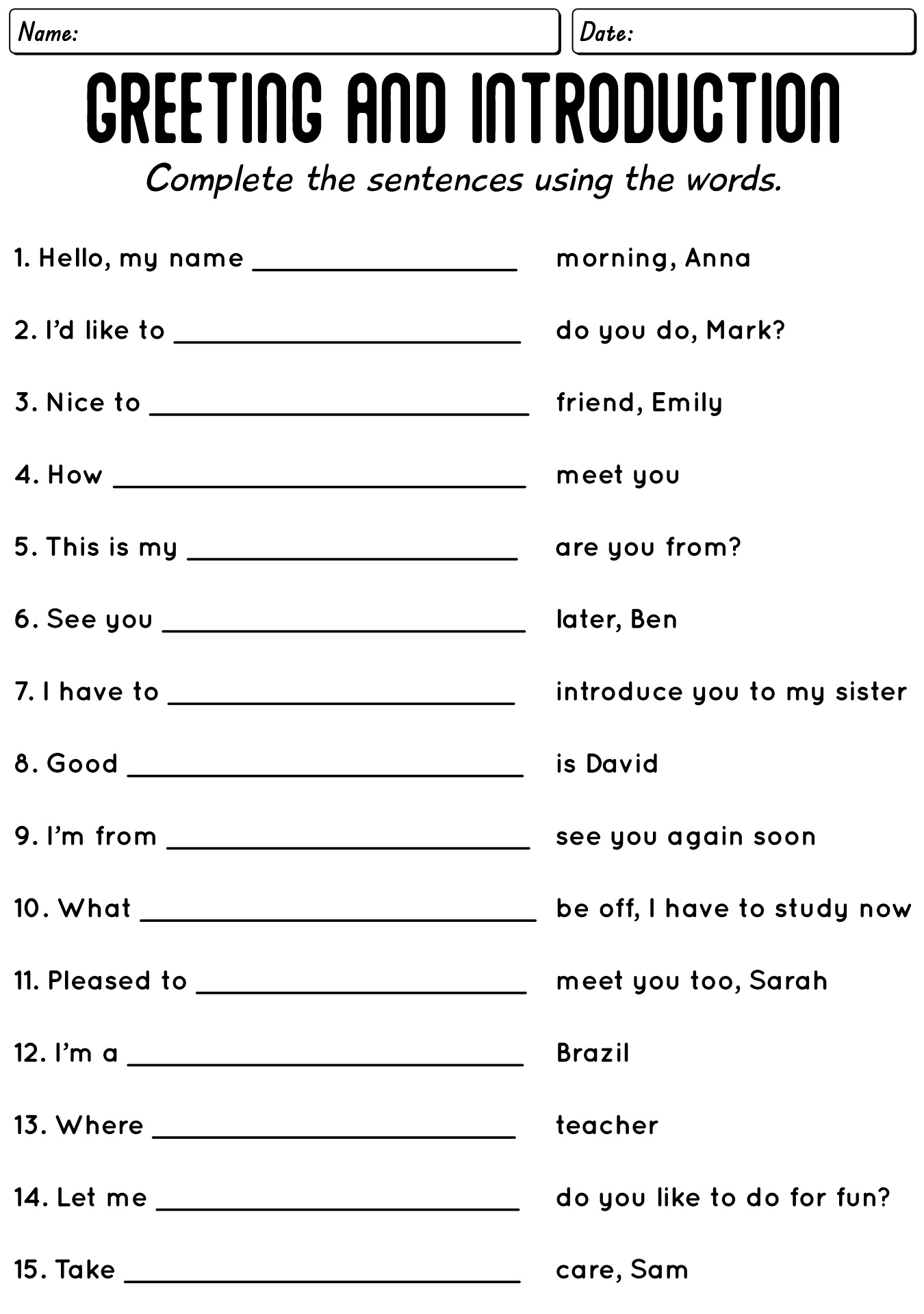 - Middle and High School: As students progress to middle and high school, they can delve deeper into advanced introductions and greetings worksheets. These worksheets can incorporate more nuanced language structures, idiomatic expressions, and formal introductions suitable for academic and professional settings. By exposing students to a wide range of greetings and introductions, educators can prepare them for real-world scenarios such as job interviews, social gatherings, and networking events.
