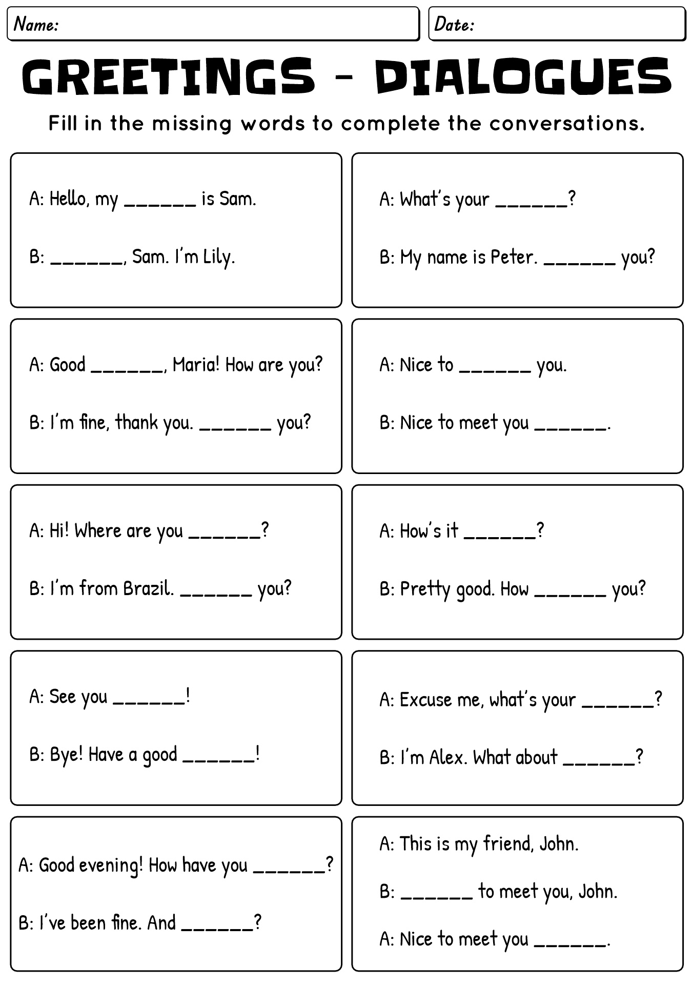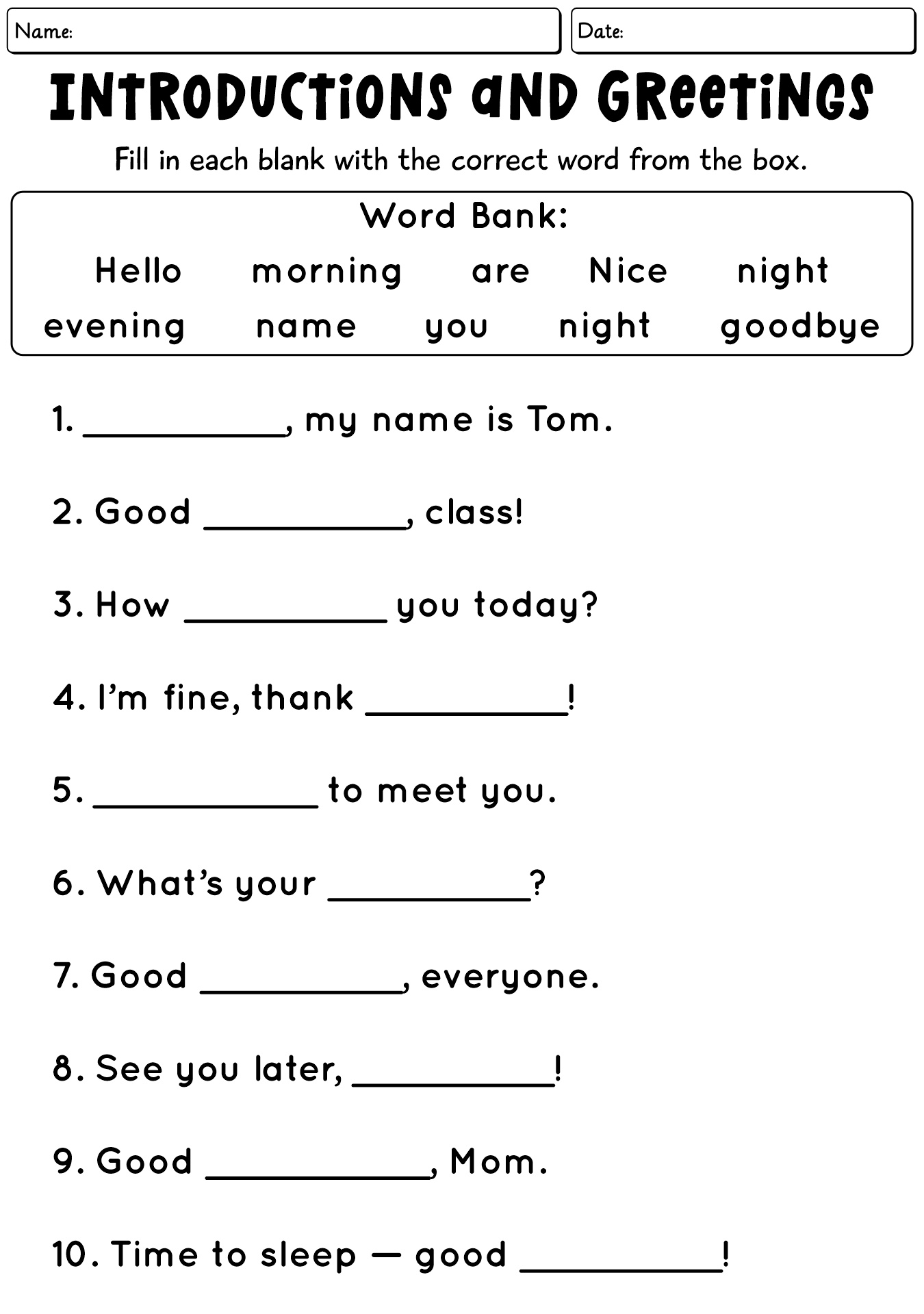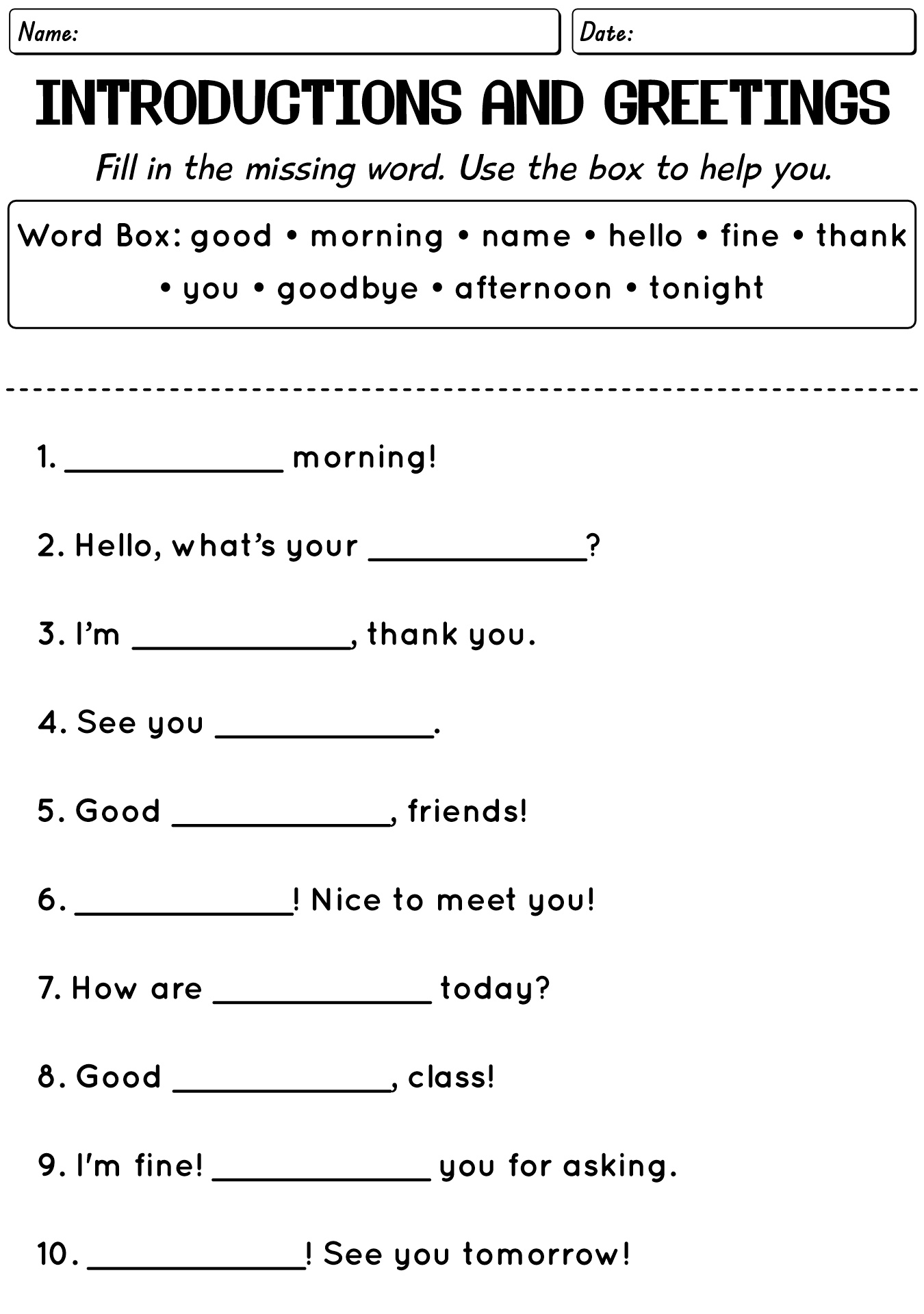 - Middle and High School: As students progress to middle and high school, they can delve deeper into advanced introductions and greetings worksheets. These worksheets can incorporate more nuanced language structures, idiomatic expressions, and formal introductions suitable for academic and professional settings. By exposing students to a wide range of greetings and introductions, educators can prepare them for real-world scenarios such as job interviews, social gatherings, and networking events.