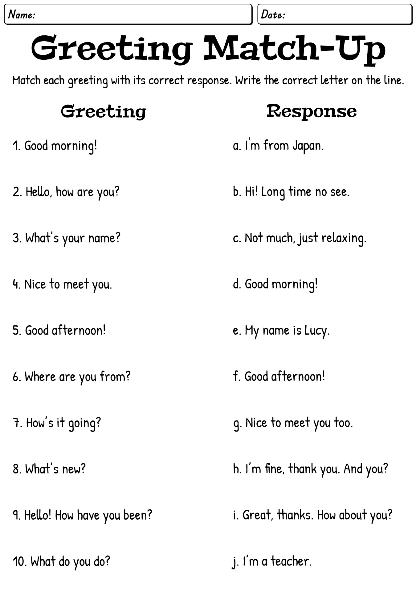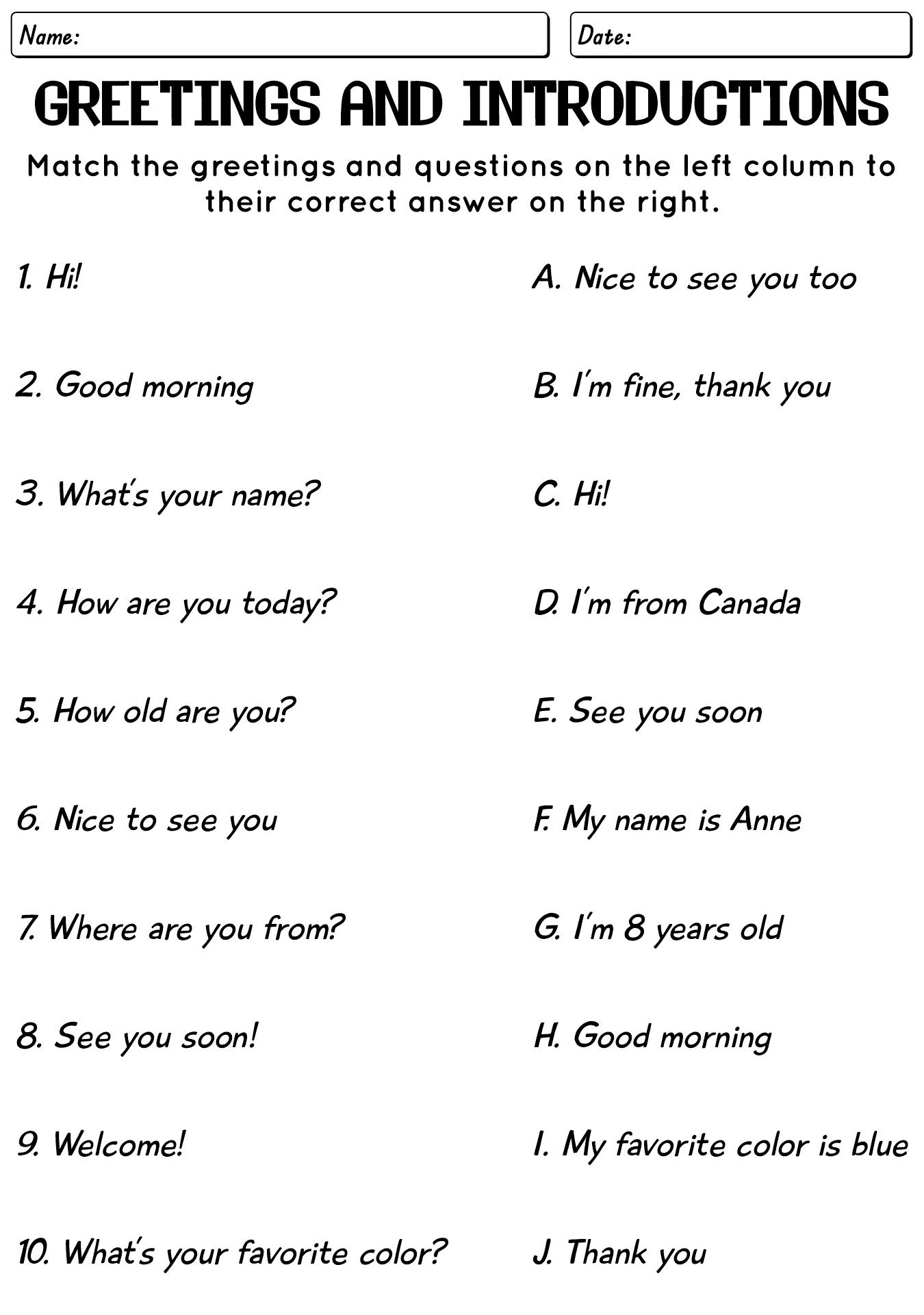 - Interactive Worksheets: Incorporate interactive worksheets that require students to fill in the blanks with appropriate greetings or introductions. You can also include matching activities where students have to match the correct greeting with its corresponding situation or context. This interactive approach keeps students engaged and helps them apply what they have learned.