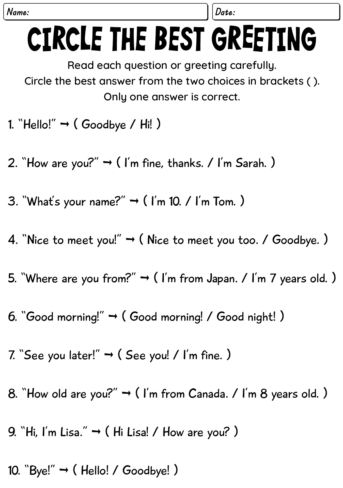 With guided activities and role-play scenarios, learners become more confident using phrases like “Hello,” “Nice to meet you,” and “My name is...”. These worksheets also expose students to cultural expectations and polite expressions commonly used in real-life interactions. Perfect for classroom or individual practice, they build strong communication habits from day one.