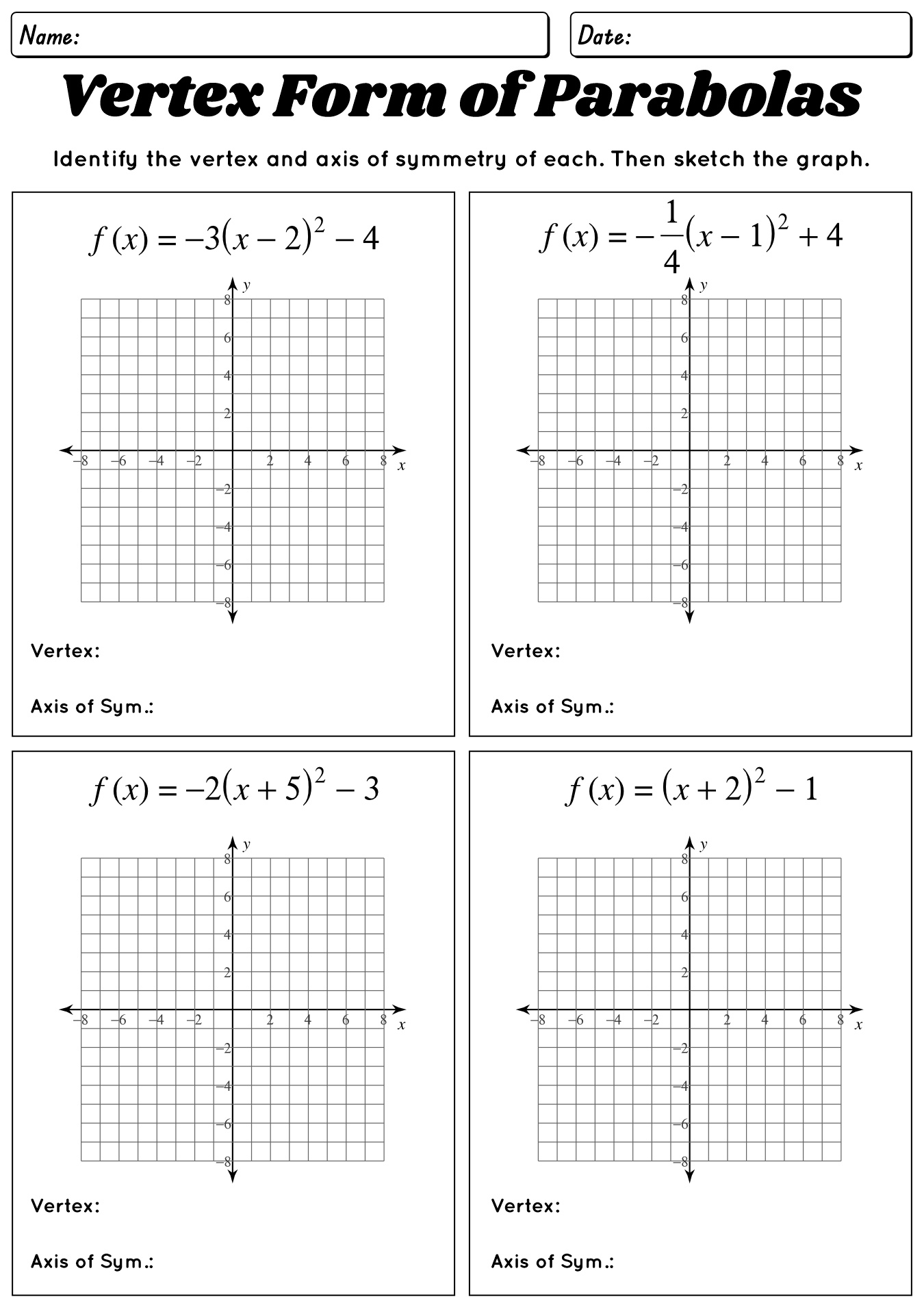 - Problem-Solving Skills: By analyzing and graphing various quadratic functions, students learn to interpret graphs, identify key features such as the vertex and axis of symmetry, and solve equations using graphical methods.