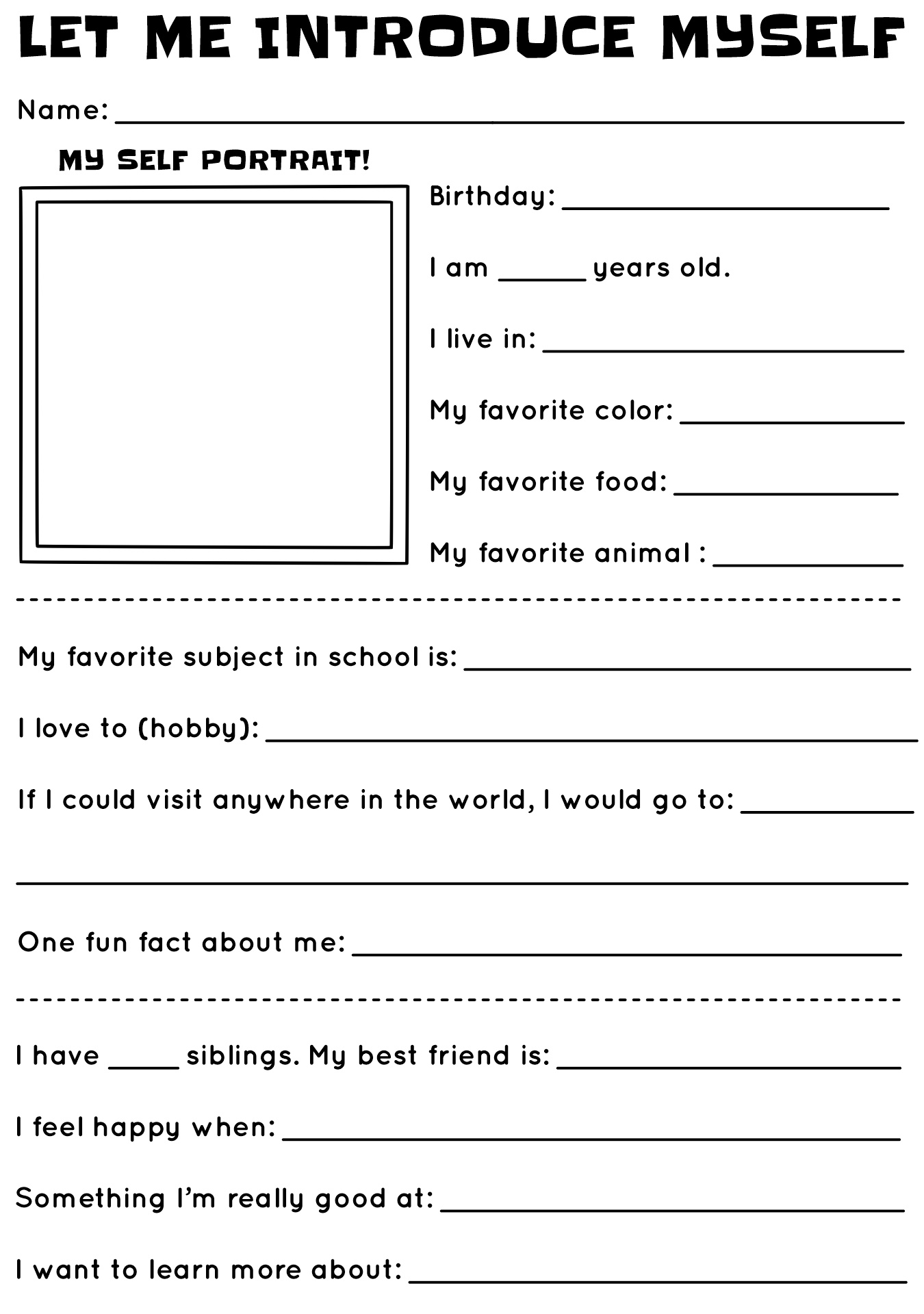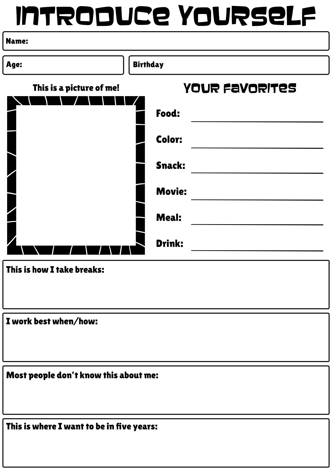 - Additionally, an introduction about myself worksheet can help break the ice and ease any tension or nervousness that students may feel on the first day back to school. It provides a low-pressure way for students to introduce themselves to their classmates and the teacher. This can create a more relaxed and welcoming atmosphere in the classroom, which is conducive to learning and building relationships.