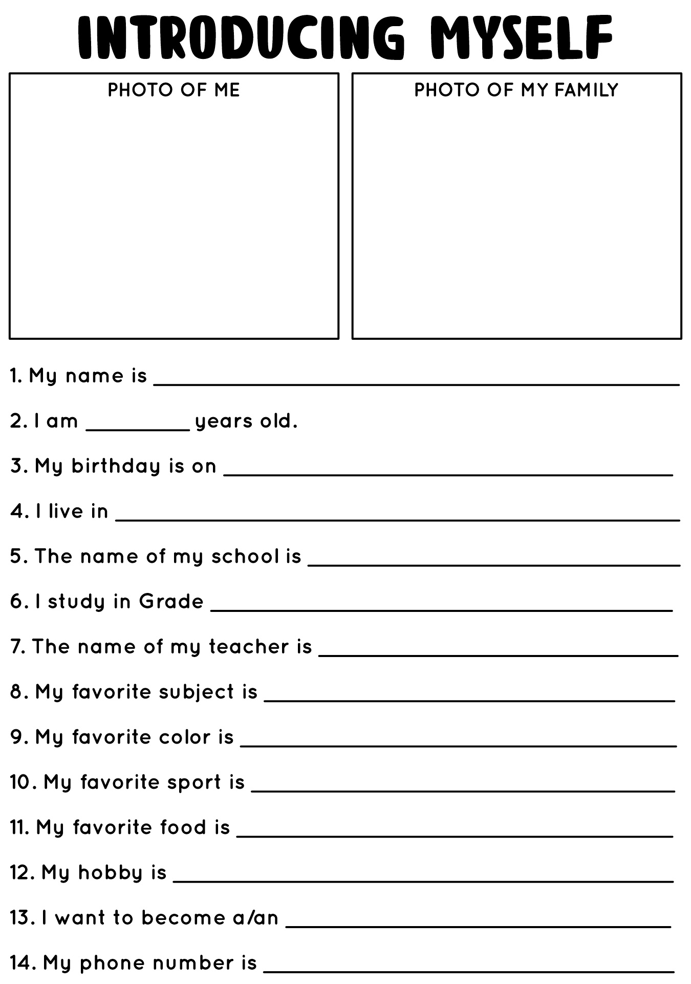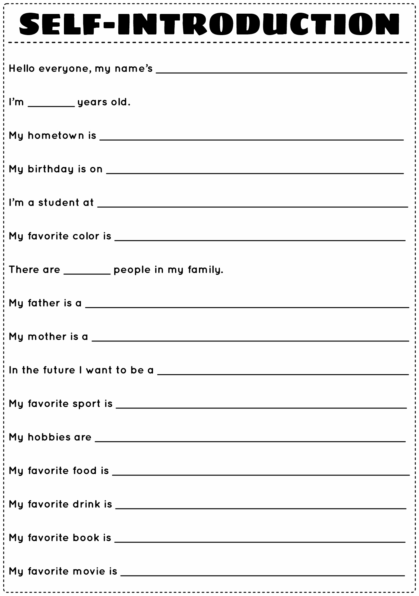- Enhancing Writing and Presentation Skills: The act of filling out the worksheet involves writing a short paragraph or list about yourself. This exercise helps you enhance your writing skills by encouraging you to craft a cohesive and engaging piece of text. Additionally, when you share your introduction with your classmates, you are practicing presentation skills, such as speaking clearly, maintaining eye contact, and engaging your audience.