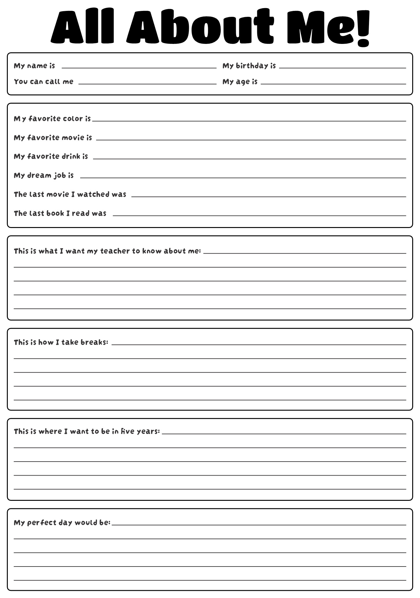 - Firstly, this worksheet allows students to share information about themselves in a structured and organized manner. By filling out the worksheet, students can express their interests, hobbies, and goals, helping the teacher get to know them better. This can create a sense of connection and understanding between the teacher and the students right from the beginning of the school year.