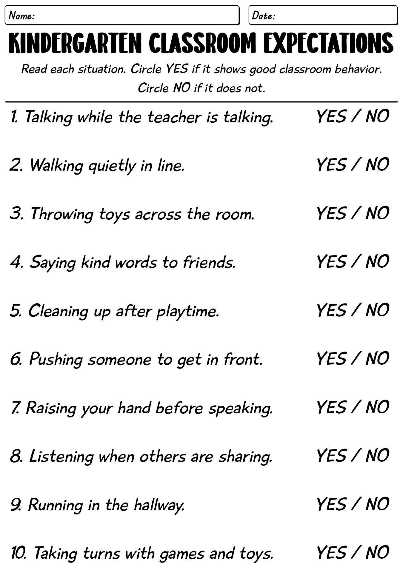 - Kindergarten Classroom Expectations Activity Sheet