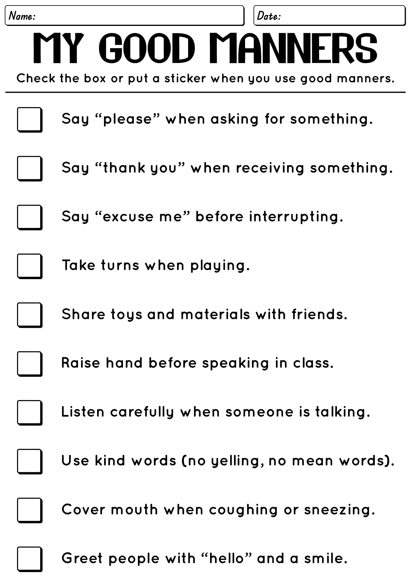 - Kindergarten Good Manners Checklist Activity