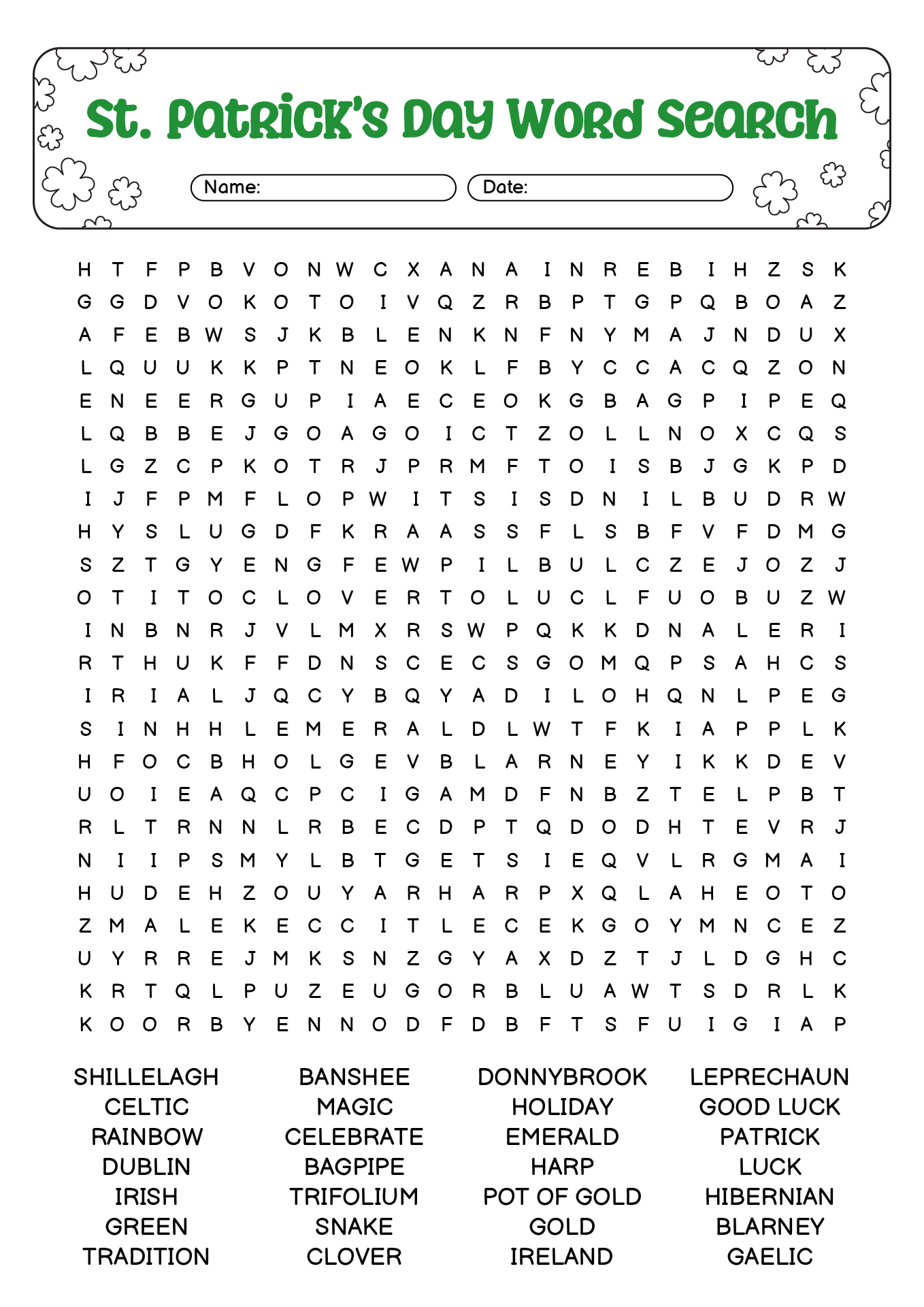 - Word Searches: These worksheets encourage children to find and circle specific words related to Saint Patrick's Day in a grid of letters.