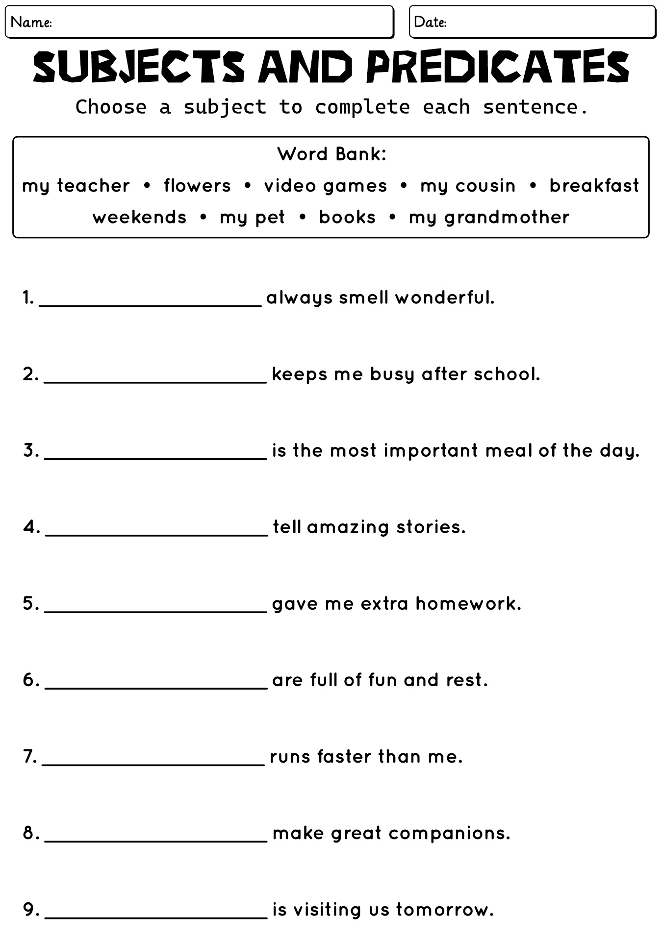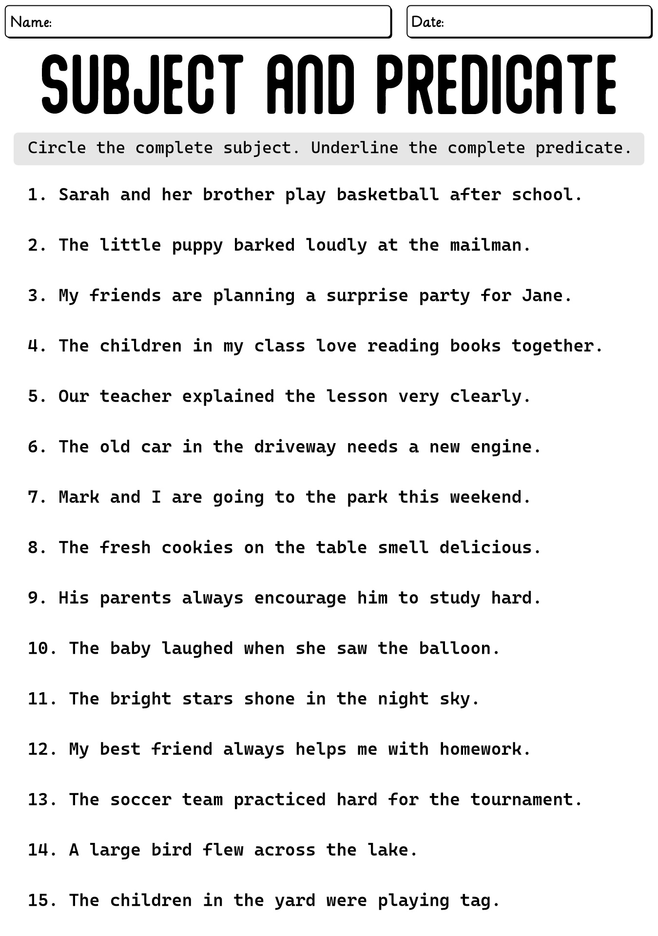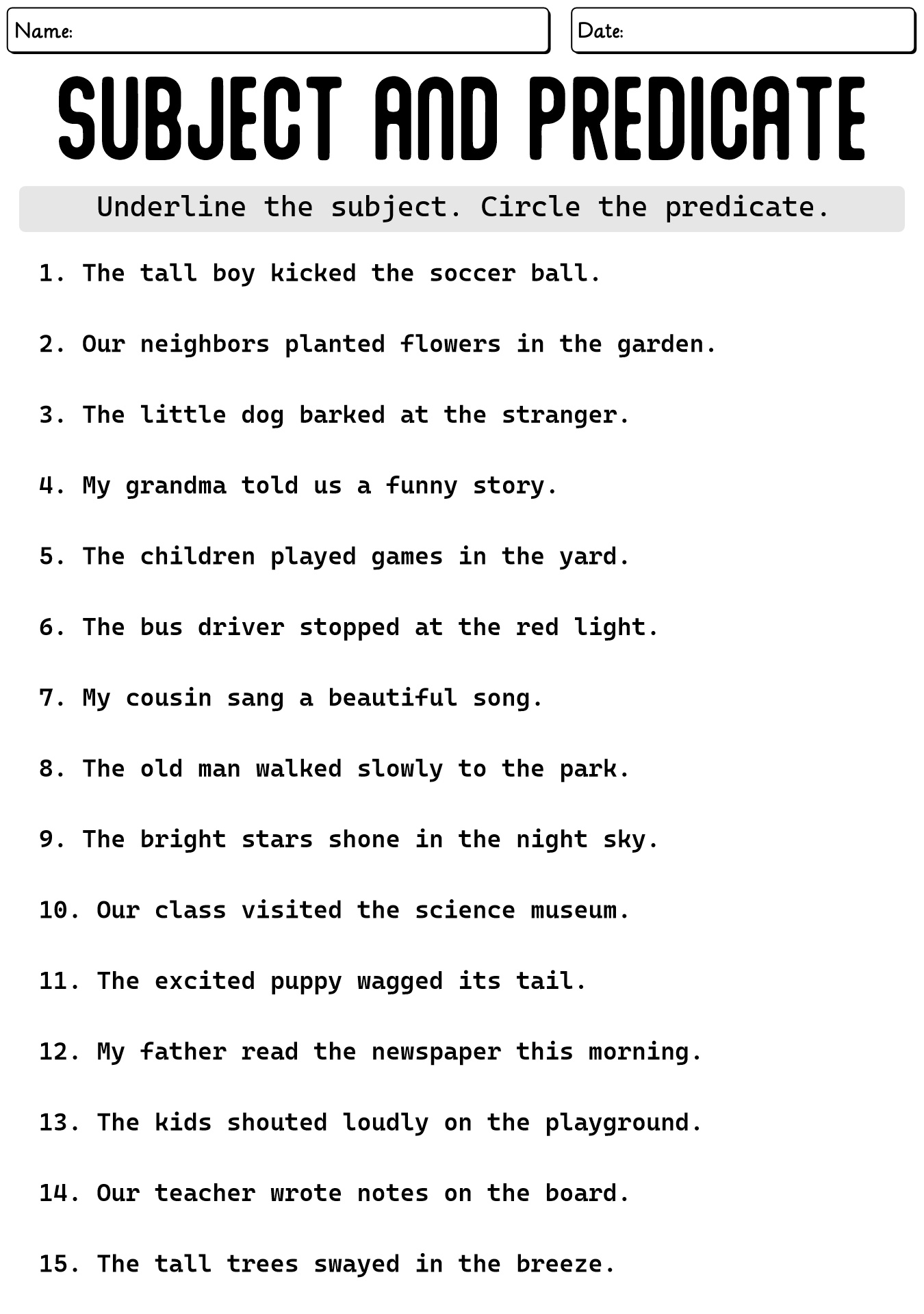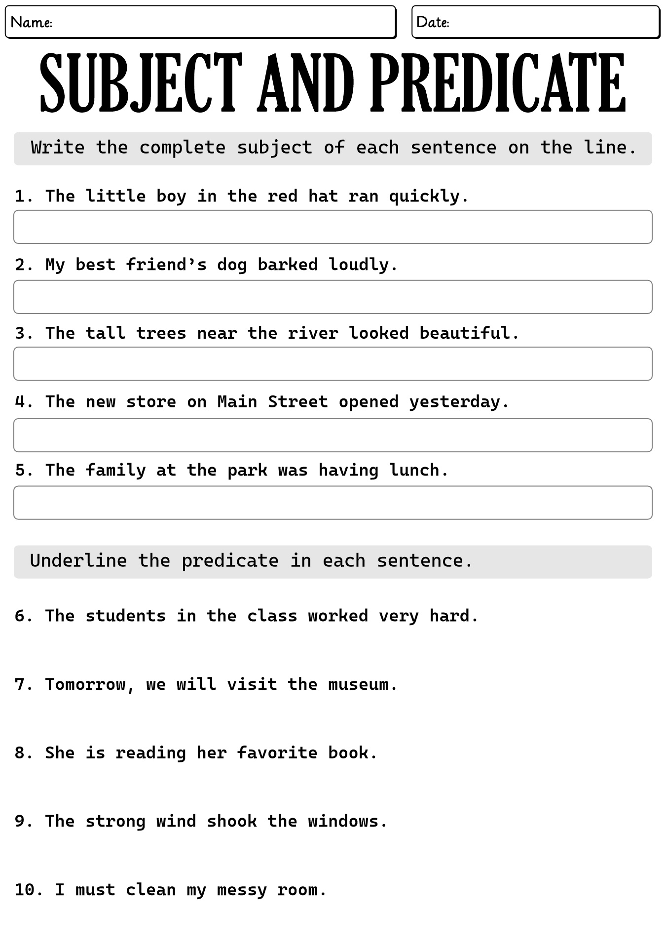 - Enhancing Language Fluency: Practice with subject and predicate worksheets helps students become more fluent in identifying and using these elements in their own writing. This fluency contributes to improved language skills and communication abilities overall.