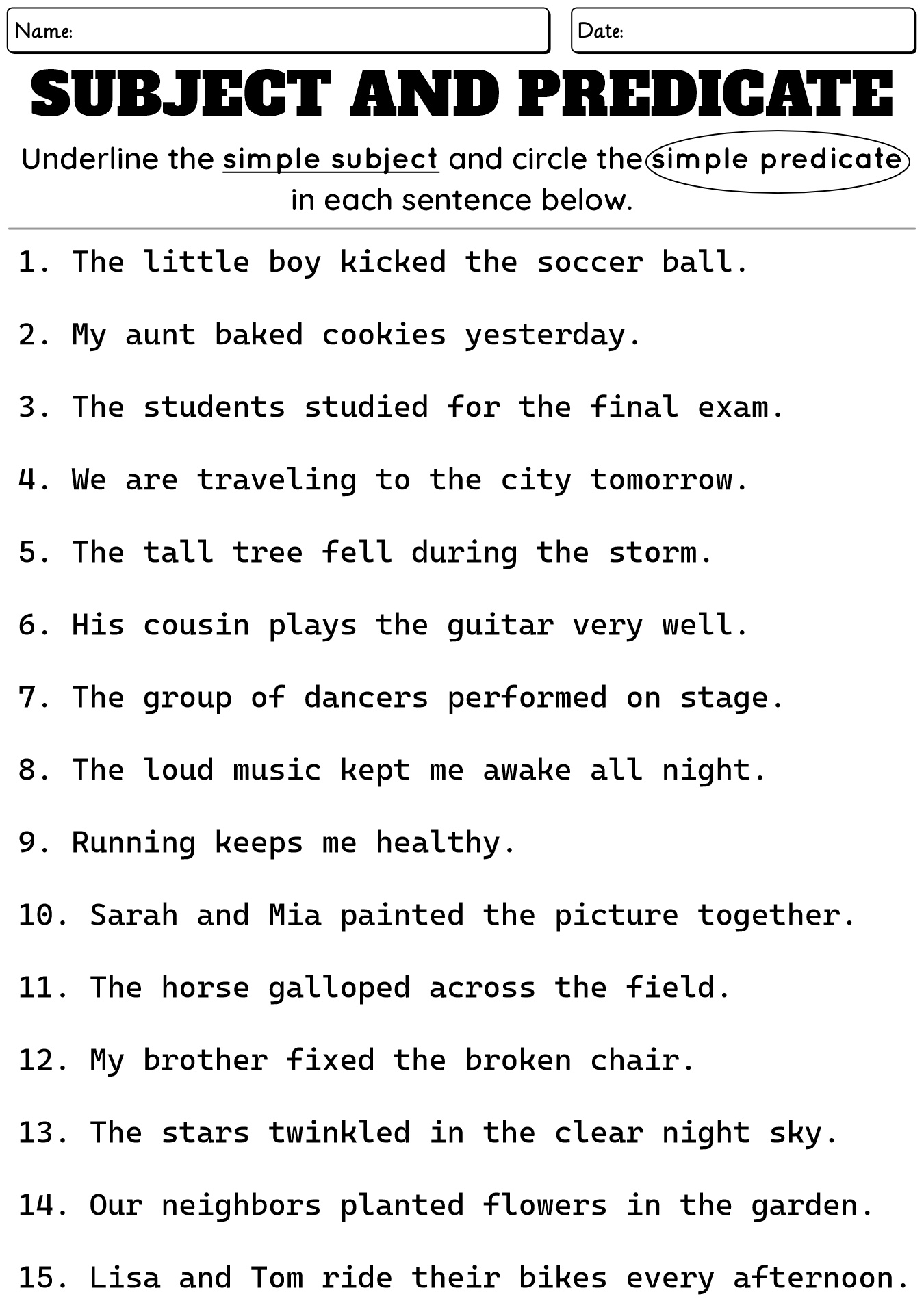 Yes! Simple subject and predicate worksheets provide students with structured exercises that allow them to practice identifying and constructing sentences with ease. By working through these worksheets, students can develop a strong foundation in grammar, sentence structure, and overall writing skills.