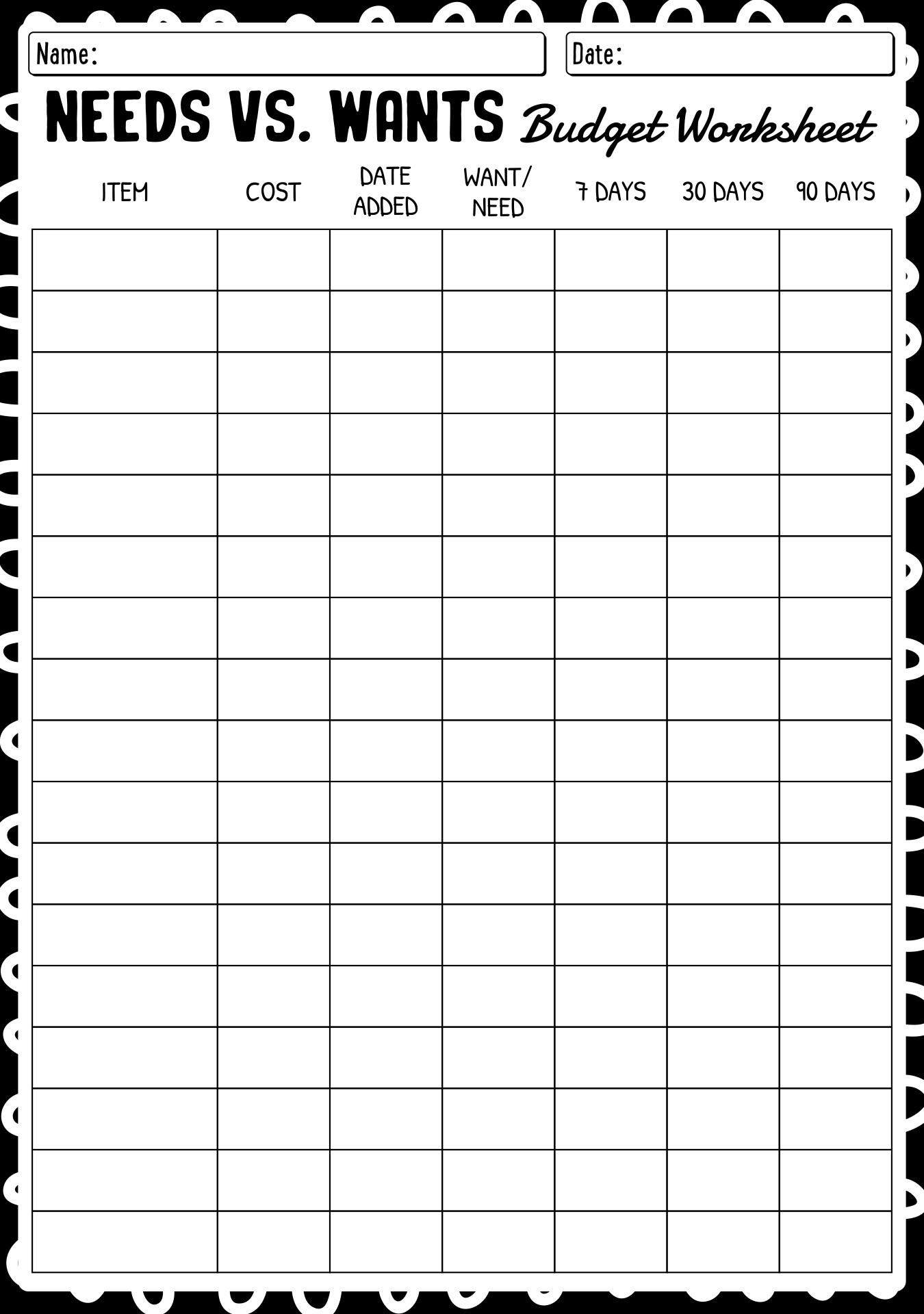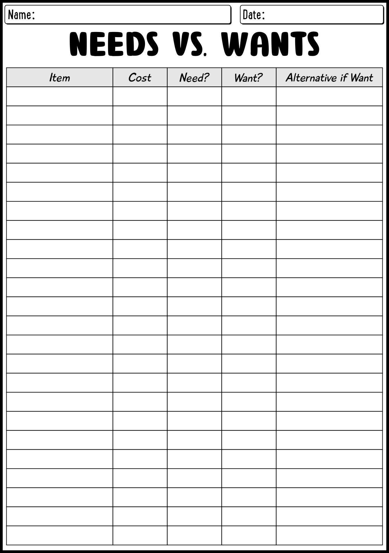 - Sorting or Categorizing Table: List spending items and assign them into “Need” or “Want.”